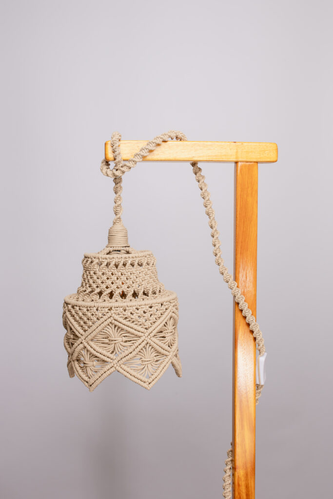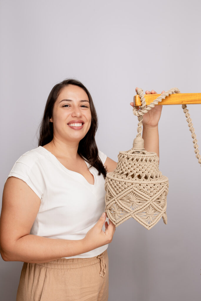 Resposta: Descobri na pandemia um amor pelas plantas e comecei a fazer macramê para decorar minha casa e deixar o espaço mais aconchegante. A produção cresceu e me fez tão bem que acumulei uma quantidade de peças e resolvi começar a divulgar e vender. Nesse processo de descoberta, comecei a fazer um curso de aprendiz de marcenaria, onde encontrei meu atual sócio e companheiro de vida, e onde me surgiu o incômodo pelo quantitativo de matéria-prima que era descartada em uma marcenaria de grande porte. Resolvi então criar peças para aproveitar ao máximo esse material, evitando assim o descarte. Surgiram as luminárias, que trazem um misto entre as técnicas de macramê e marcenaria.